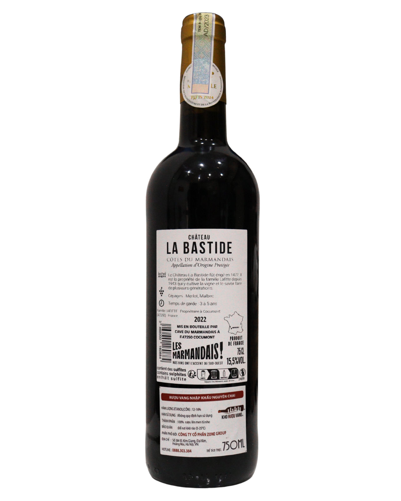 Château La Bastide, khởi nguồn từ năm 1472, tọa lạc trên đỉnh làng Cocumont và được gia đình Lafitte tiếp quản từ năm 1943. Với 57 ha đất sỏi và đất sét giàu dinh dưỡng, nơi đây trồng các giống Merlot, Cabernet Franc, Sauvignon Blanc và Sauvignon Gris. Rượu vang mang hương mận đen, lý chua và cherry đỏ, hòa cùng vanilla, gỗ sồi và thoang thoảng khói tẩu. Cấu trúc đầy đặn, tannin chắc nhưng mượt, vị khô nhẹ cân bằng. Hậu vị kéo dài, điểm chút cay ấm tinh tế, tạo nên chai vang full body đậm đà, quyến rũ và để lại ấn tượng sâu sắc.